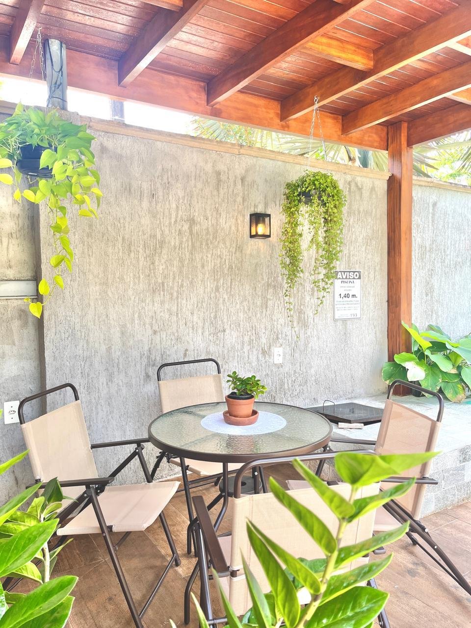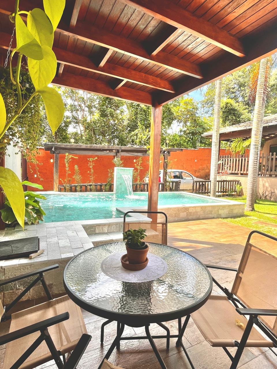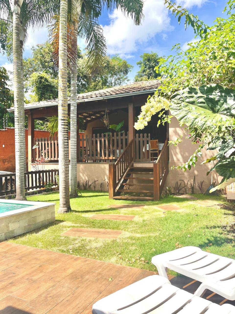 Espaços amplos e arejados circundada de área verde possuindo varanda e jardim com piscina com aquecimento solar, hidromassagem, cascata e ducha. A casa é composta por 3 quartos, sendo uma  ampla suíte com tv smart, todos com ar condicionado.