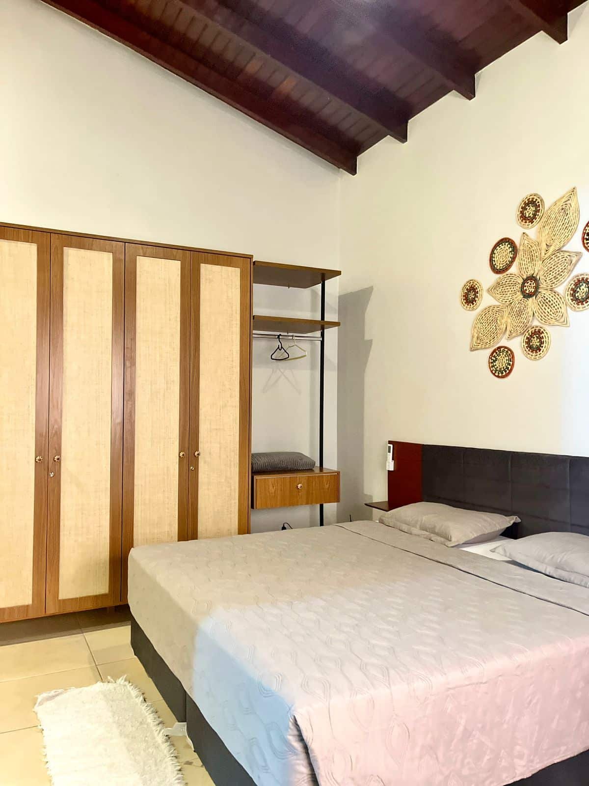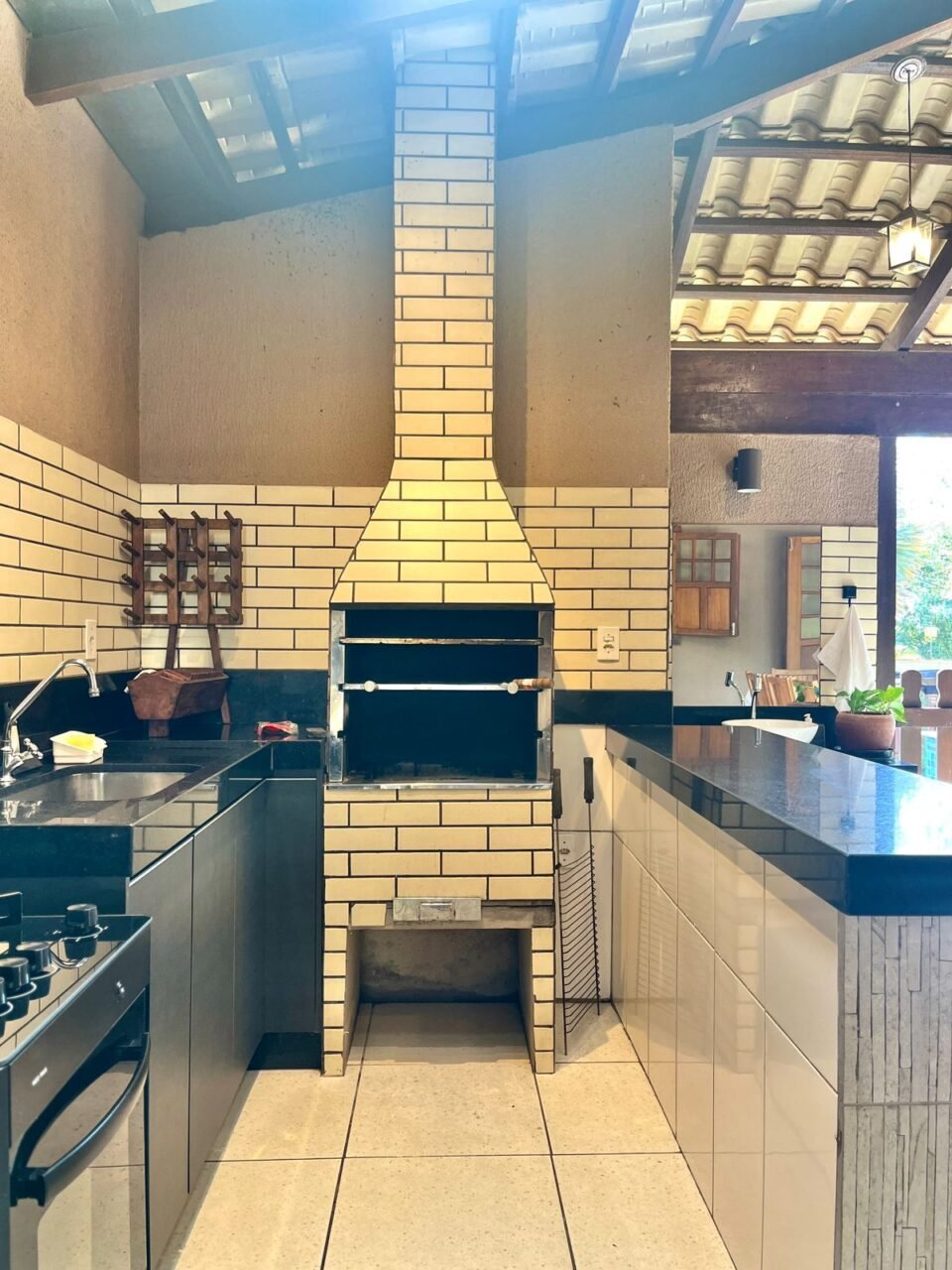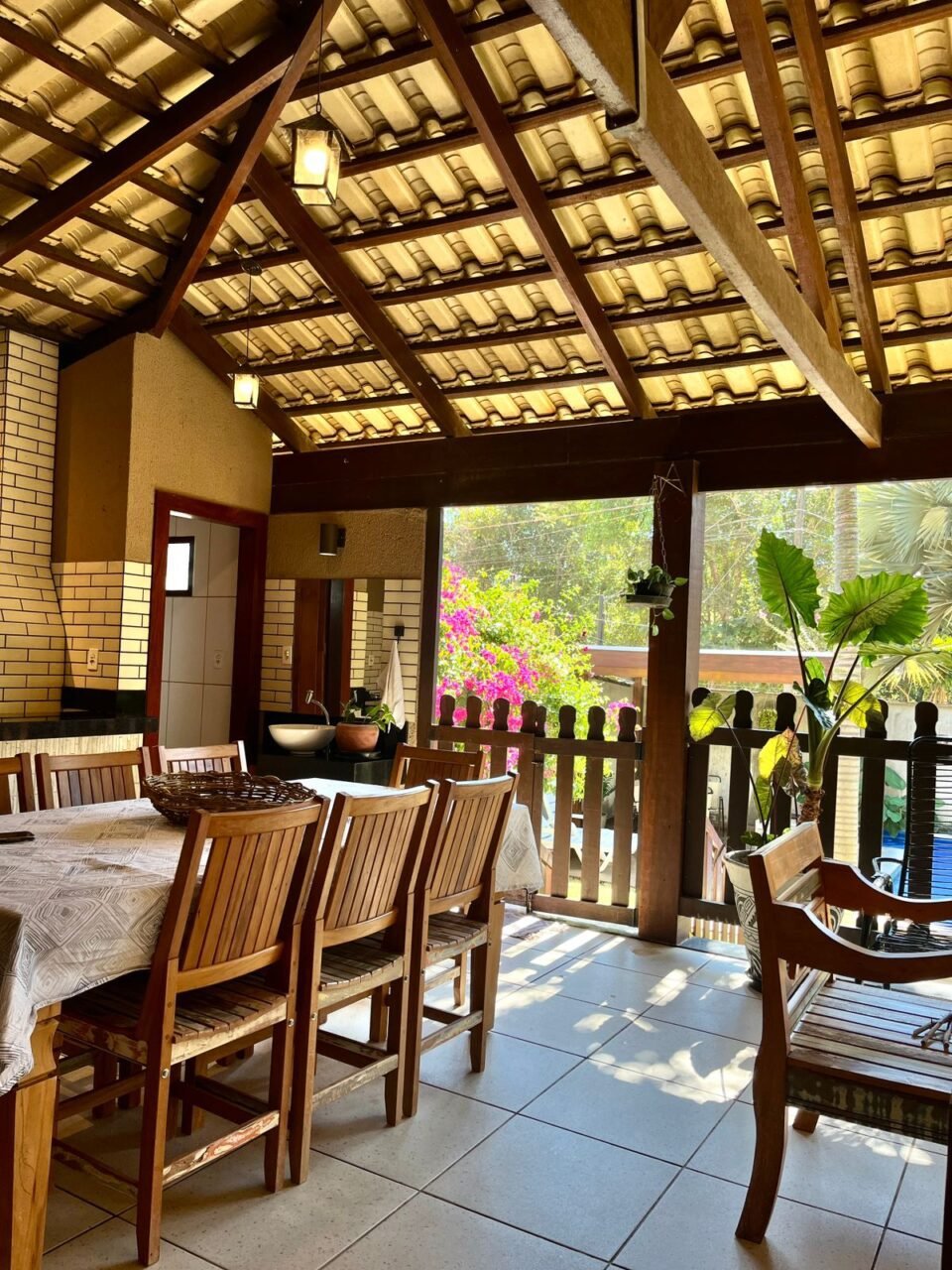 A casa possui, além dos quartos, varanda ampla com churrasqueira e freezer, jardim com piscina com aquecimento solar, dois banheiros e um lavabo, sala com Smart TV, cozinha completa, lavanderia e canil.