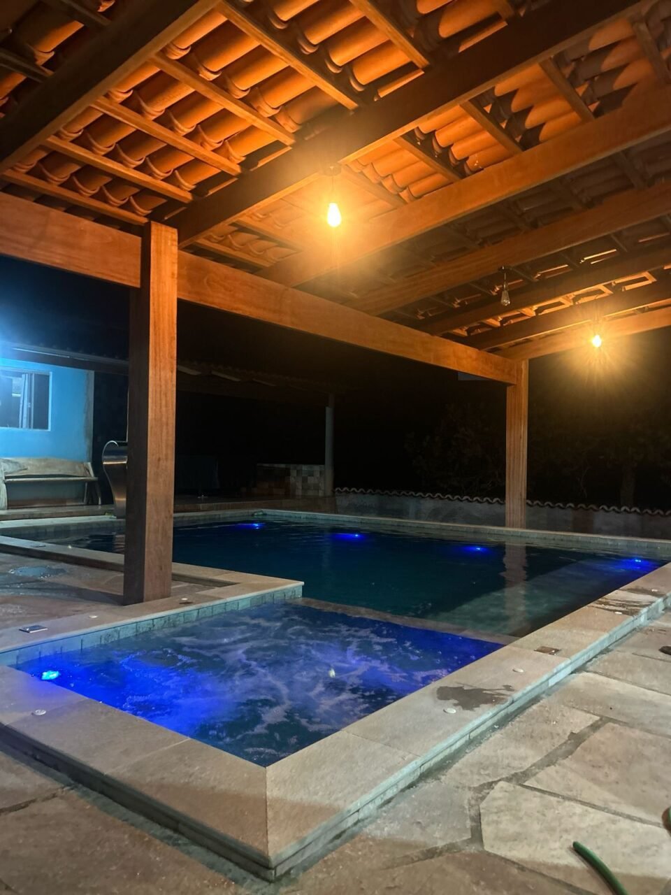 São 04 suítes com entradas privadas, cozinha completa, churrasqueira, mesa de sinuca, banheiro externo, piscina com hidromassagem e aquecimento elétrico.